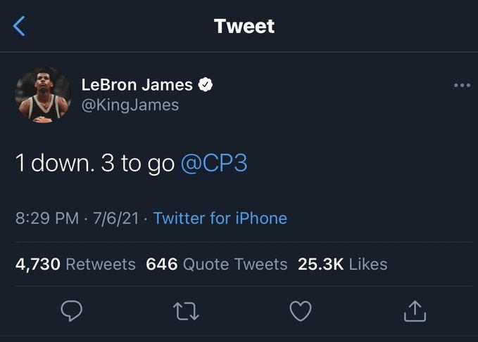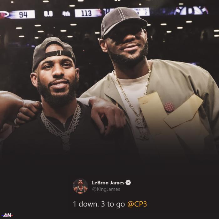 保罗密友勒布朗-詹姆斯也第一时间发推:恭喜保罗拿下总决赛第一场,距离夺得总冠军还差3场胜利。