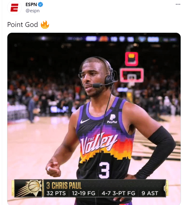 36岁保罗首节0分,后三节轰下32分,尤其是第三节独砍16分,末节掌控局面,最终太阳稳稳拿下总决赛开门红;保罗总决赛首秀32分8助攻引热议,美媒ESPN直呼控卫之神(Point God)。