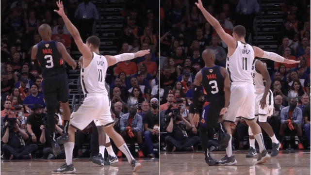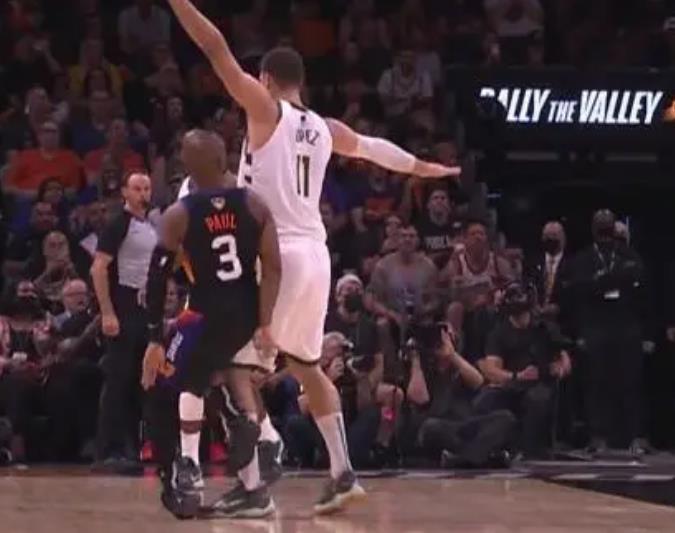比赛的焦灼,也让这场比赛又出现了争议的画面,比赛来到了第三节还剩下10分17秒的时候,保罗错位单打雄鹿队的大洛佩兹。在连续的运球之后,保罗抓住大洛佩兹防守的不及时,干拨出手三分。
