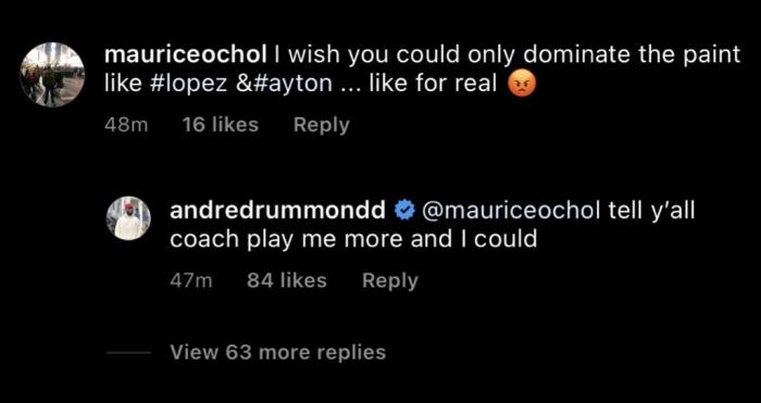 庄神如此言论引热议,很明显他不满自己在湖人队内的上场时间——加盟湖人之后,庄神常规赛场均上场24.8分钟轰下11.9分10.2篮板,季后赛场均21分钟拿到9分11篮板;庄神抱怨上场时间太少,之后庄神更是发推自比“天勾”贾巴尔,发推写道:卡里姆-阿卜杜尔-德拉蒙德。