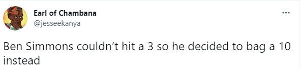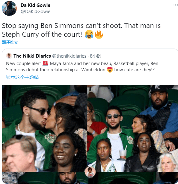西蒙斯亲吻女友引热议,有球迷转发两人亲密照并且发推:别再说西蒙斯不会投篮了,他是场外的史蒂芬-库里;还有球迷调侃西蒙斯不会投三分,因为他决定改投10分球;更有球迷调侃西蒙斯已经开始休赛期训练。
