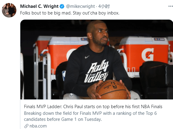 从NBA官网FMVP排名以及最新FMVP赔率来看,保罗是今年FMVP的头号热门,换句话说,他们更看好太阳夺得总冠军,除了logo男输掉总决赛仍获得FMVP之外,其他FMVP获得者都在夺冠球队中产生。