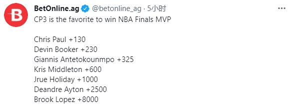 保罗赔率+130排名第一,布克+230排名第二,字母哥+325排名第三,米德尔顿+600、霍勒迪+1000、艾顿+2500以及大洛佩兹+8000。