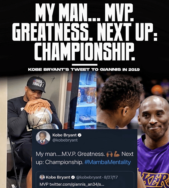 这件事情的起因是在2017年,当时传奇科比为还很年轻的字母哥设了一个目标,赢得常规赛MVP,2年之后希腊人做到了,他斩获了自己职业生涯中第一座MVP奖杯。很快科比就在社交媒体上送祝福,同时给字母哥定下了又一个目标,那就是总冠军:“我的兄弟。 MVP。伟大。下一个目标:总冠军”