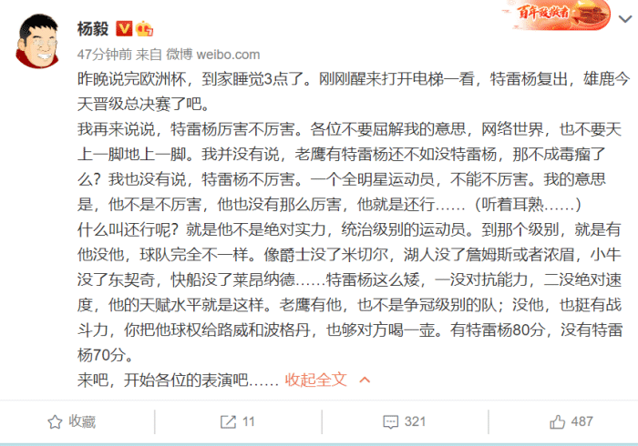 而杨毅的一番话又被球迷攻陷了微博,此前他说特雷杨的球权给路威数据不会差,这一次又在微博上再次重申了自己这个观点,意思就是特雷杨不厉害,但有他没他老鹰差距没那么大。他的观点直接引爆了球迷,疯狂在底下回复抨击他,还有人劝他少说这种话以免招黑!
