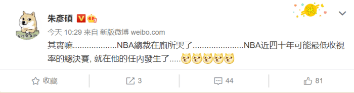 不过对于今年的总决赛,普遍的看法就是看点不多,收视率可能无法保证,远不能与“黄绿大战”“勇骑大战”这样的比赛相比。所以国内名嘴朱彦硕就在社媒调侃“NBA总裁在厕所哭了,NBA近40年最低收视率的总决赛,就在他的任内发生了 ”但这也没办法,总不能搞一些黑幕来达到商业目的吧,竞技体育只看结果!