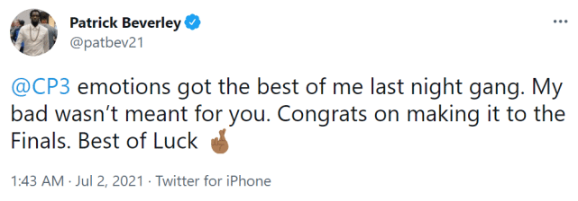 贝弗利随后在社媒上向保罗道歉。他写道:“CP3,昨晚我情绪失控,我的错,并不是针对你。恭喜你打进总决赛,祝你好运。”