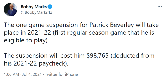 薪金专家鲍比-马克斯表示,贝弗利这次禁赛带来的薪金损失是98765美元,将从他的2021-22赛季的薪水中扣除。换言之,贝弗利这一推,损失了近10万美元。