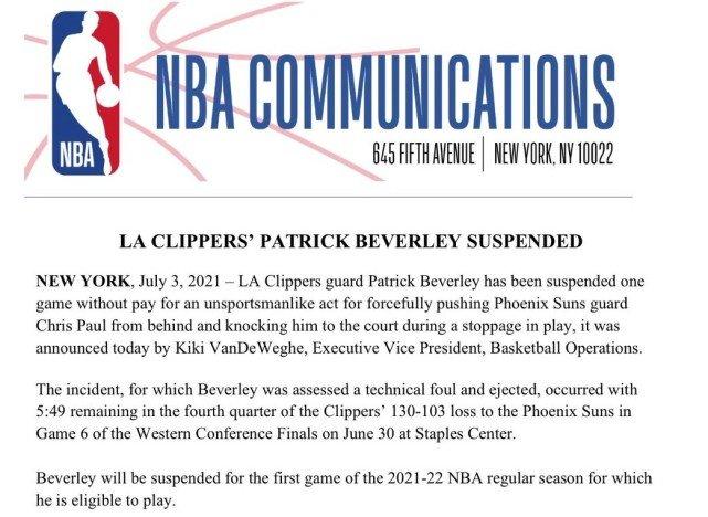 来源:JRS直播网07-04 15:03JRS直播网讯 北京时间7月4日,NBA官方宣布,由于在西决G6中推倒太阳队后卫保罗,快船后卫贝弗利将被无薪禁赛一场。禁赛将在2021-22赛季的首场比赛执行。值得一提的是这竟然是贝弗利生涯首次被联盟禁赛,此前他曾五次被联盟罚款。