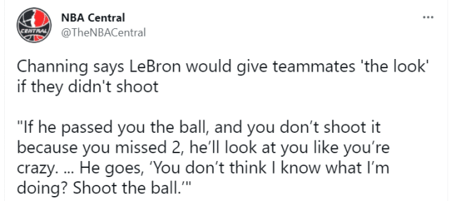 来源:JRS直播网07-04 14:59JRS直播网讯 北京时间7月4日,钱宁-弗莱,詹姆斯的骑士前队友,在一档节目上表示如果队友出现机会却不投篮,詹姆斯绝对会给你脸色看。