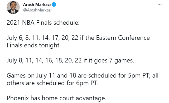 Markazi指出,如果东决在6场内结束,总决赛首战将在7月7日(北京时间,下同)打响,G2是7月9日,G3是7月12日,G4是7月15日。如有必要,G5是7月18日,G6是7月21日,G7是7月23日。
