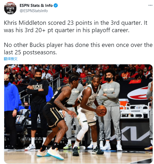 米德尔顿单节独砍23分创职业生涯单节得分纪录,职业生涯第三次季后赛单节20+,成为雄鹿队史近25年第一人;今年季后赛第四次单节15+,仅次于杜兰特和米切尔成联盟第三人。