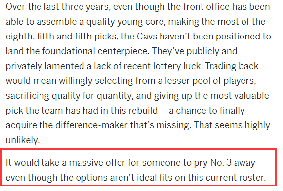 骑士高层的心态可以理解,选择兜售探花签,可见骑士并不满足于探花签的顺位,愿意就此放弃,并用探花签寻求更好的资产。另一方面,骑士想要状元签可以理解,但骑士别叹手气不好,就算给了骑士状元签,在非选秀大年的情况下,骑士的选人眼光不见得很好,在没有詹姆斯的时代里,骑士就用状元签选择了水货状元本内特并成为笑柄。