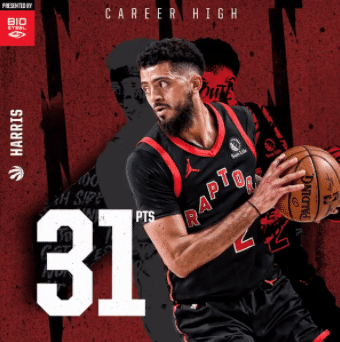 哈里斯也不例外,5月15号对阵独行侠比赛出战36分钟,21投12中,三分球12投5中狂砍生涯新高的31分外加2板4助1断,此前最高得分纪录为17分,同时是猛龙本赛季第10位得分30+的球员。