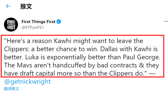 在节目中,尼克怀特说道:东契奇远强于乔治,而且独行侠也没被烂合同束缚手脚,他们手上拥有比快船更多的选秀资产。快船当初为了得到乔治,导致现在没有运作空间。如果小卡想再次夺冠,独行侠是更好的选择。
