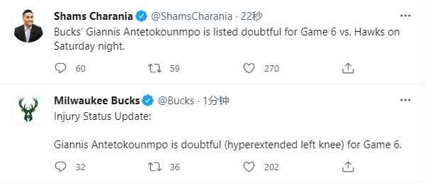 雄鹿官方也已经更新字母哥伤情——字母哥(左膝过度伸展)被列为不太可能出战,仅有25%可能性出战;换句话说,字母哥因伤大概率缺席东决G6。