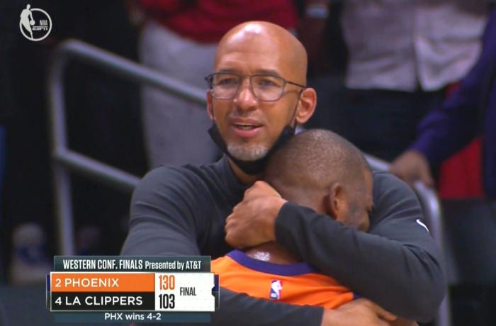 CP3连续喊了几声“教练”后直接扎进太阳主帅的怀抱里,露出一脸幸福的笑容。