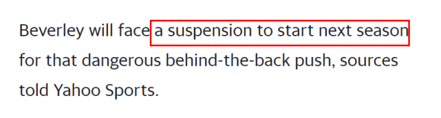来源:JRS直播网07-02 14:48JRS直播网讯 北京时间7月2日,据NBA记者克里斯-海耶斯报道,由于在西决G6故意推倒保罗,贝弗利将被联盟禁赛。快船的赛季已经结束,因此,禁赛处罚将在下赛季开始后生效。