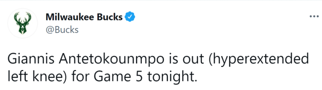 字母哥的这次受伤,发生在东决G4的第三节中段。当时,字母哥试图封盖卡佩拉的空接扣篮,但他在落地时,左膝明显反向弯曲,随后,他痛苦倒地,在队友搀扶下离场。