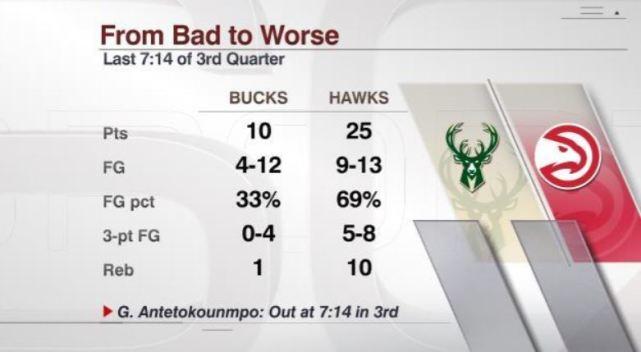美媒也列出了当时的数据对比,第三节最后7分14秒,雄鹿只得到10分,12投4中,命中率33%,三分4中0,只抢到1个篮板。同期的老鹰得到25分,13投9中,命中率69%,三分8投5中,抢到10个篮板。