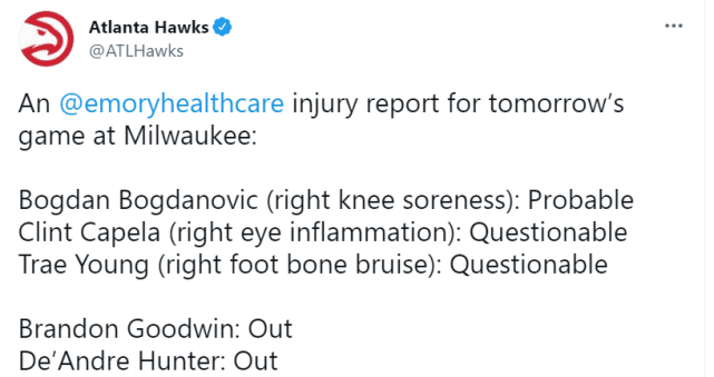 这意味着卡佩拉和特雷-杨都有可能在G5复出,如果他们能够出战,对于老鹰来说,绝对是超级利好。毕竟,雄鹿一方的伤情也已出炉,字母哥是doubtful(大概率不打,出场可能性25%)的状态。老鹰有机会借着上一场的势头,再赢一场。