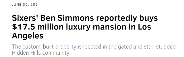 在洛杉矶购置房产,是否会影响到西蒙斯在费城的未来?目前还不得而知。西蒙斯在2019年和费城签下了一份为期5年,价值1.7亿美元的合同。虽然外界传言费城可能把他摆上货架,但费城官方的态度暂时还是留下西蒙斯,并希望在休赛期帮助他提升投篮表现。