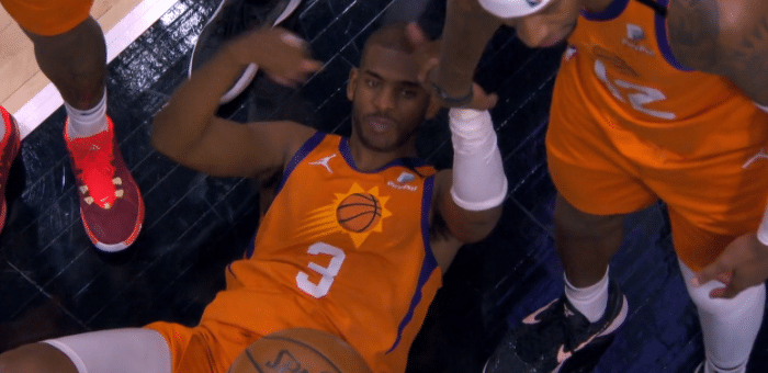 第三节保罗和考辛斯发生身体接触,考辛斯双手抱球,肘部有一个小动作,随时保罗捂着肩膀倒地不起,然后露出笑容,最终考辛斯吃到技犯,对此考辛斯一脸无辜,翻白眼十分不满。