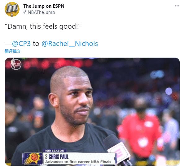 晋级之后,保罗直言赢得西部冠军的感觉太棒了,然后迫不及待地结束采访,然后和队友一起庆祝,戴着西部冠军的拥抱众队友,以及与主帅、队友等人合影;保罗第一个捧起西部冠军奖杯,然后递给太阳主帅。