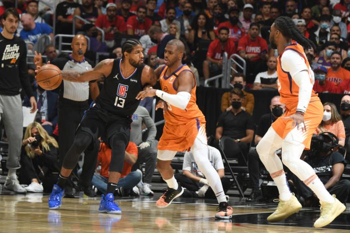 下半场,保罗和布克带队最多领先到17分,布克再次上演技惊四座的劈扣,期间暂停时,布克拿着战术板安排战术;不过太阳突然哑火,乔治带队打出10-0反扑高潮,小莫里斯和巴图姆立功;暂停回来,保罗强势回应三分,随后布克防守时被乔治肘击到面部,这仍旧是普通犯规。