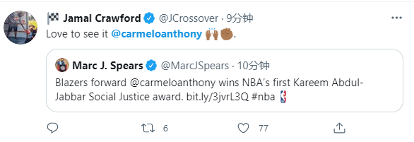来源:JRS直播网06-30 14:41JRS直播网讯 北京时间6月30日,NBA又一项大奖出炉,安东尼赢得以贾巴尔的名字来命名的年度社会正义冠军奖,成为NBA首位获得此项大奖的球员;这一个全新奖项将每年评选一次,表彰那些追求社会正义,维护联盟几十年来平等、尊重和包容价值观的球员。