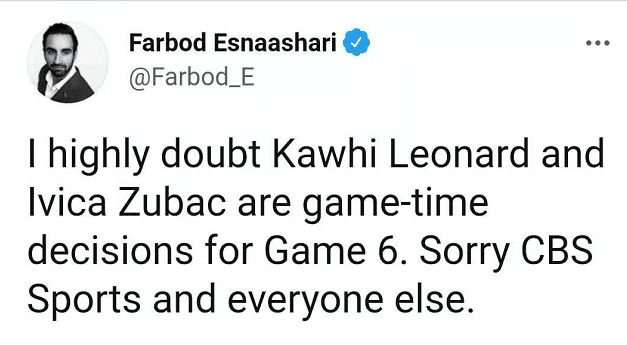 伦纳德更新了自己的状态,带来了好消息,但是很快快船队的随队记者就打脸了这个说法,快船记者FARBOD表示,他严重怀疑这个决定,伦纳德不可能出现在G6的比赛中。