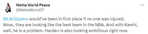 对于现在的快船,湖人名宿阿泰斯特发推写道:如果快船没有受伤的话,他们应该是第一。哇。他们看起来像是联盟中最强的球队。莱昂纳德是对手的大麻烦,而哈登现在看起来也很有野心。