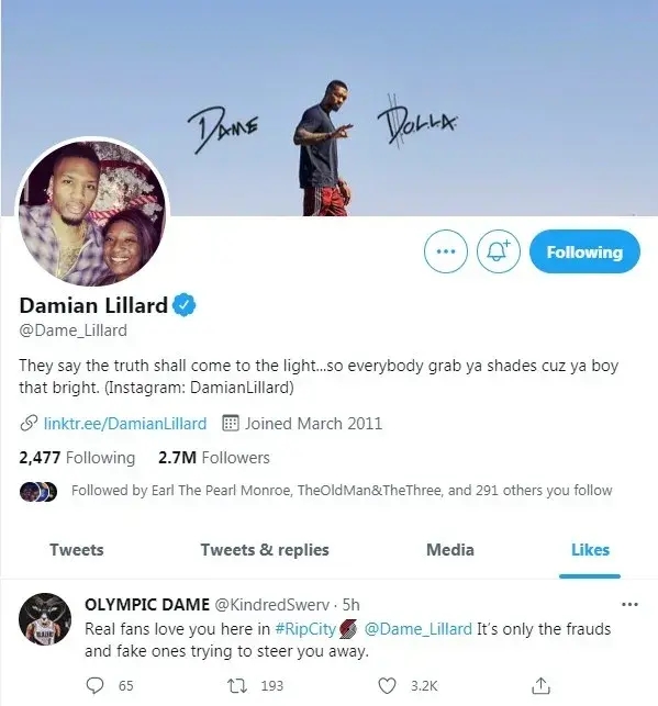 利拉德前天更是点赞了一名网友的推特,内容大意是:“真正的球迷喜欢你在撕裂之城。只有骗子和假粉才会想让你离开我们。”