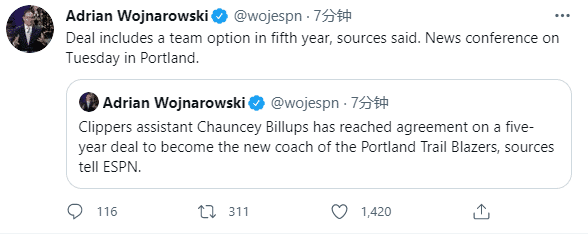 来源:JRS直播网06-28 14:33JRS直播网讯北京时间6月28日,开拓者新教练正式确定下来,据espn名记沃纳罗斯基报道,昌西-比卢普斯已经和开拓者签下一份5年执教合同——4年保障性合同和第5年球队选项,这是5年合同的一些细节,合同的具体金额暂未曝光。