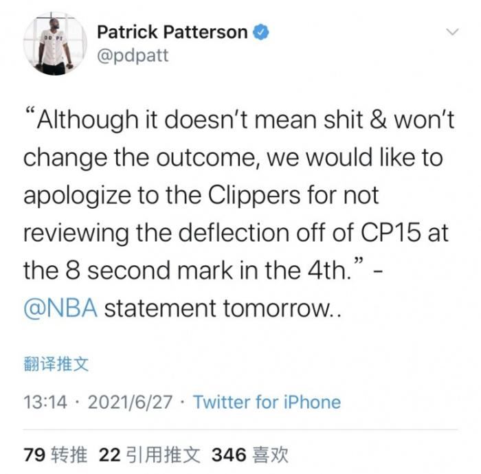 虽然是巴图姆拨了一下,但要看他拨出去之后佩恩指尖是否有碰到,但裁判拒绝看回放。如果这一球判快船球权,那结果就不一定了!不过要说判罚的话,本场快船的罚球数32:21是遥遥领先的,强度这么大的比赛不可能每个判罚都看回放,也没有必要纠结这一球,看看明日的裁判报告吧!