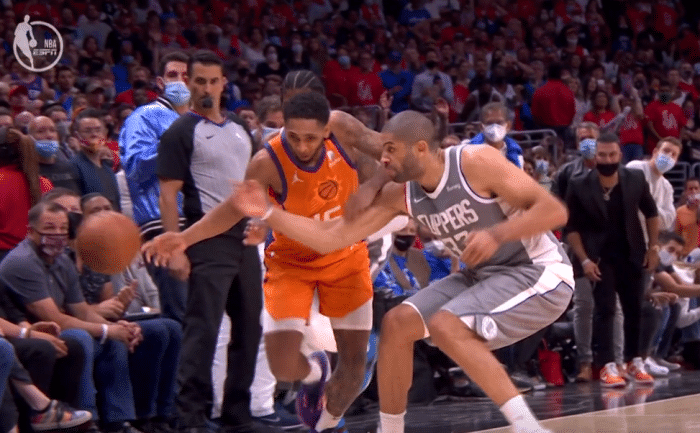 再来看一下这个球,最后13.2秒快船落后1分太阳边线球,克劳德发出来后萨里奇被包夹险些丢球,幸好佩恩及时把球拿过来但还是球出界了!当时裁判果断判罚太阳球权,贝弗利不断向裁判示意要去看录像回放但裁判不予理会,这一球通过慢镜头回放来看的确有一点争议!