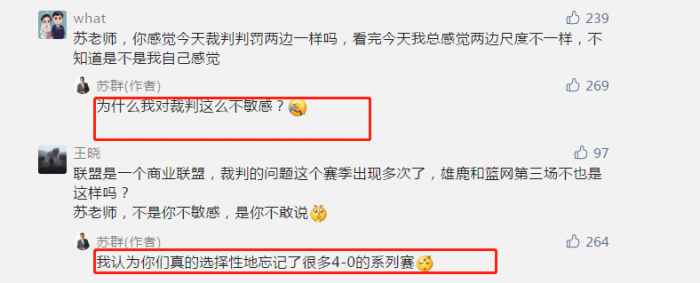 有球迷接着提问,“联盟是一个商业联盟,裁判的问题这赛季出现很多次了,雄鹿和篮网第三场不也是这样吗,不是你不敏感,是不你敢说”。而苏群老师的回应太直接,“我认为你们真的选择性忘记了很多4-0的系列赛”。言下之意,4-0横扫的系列赛那么多,说联盟控场,也是无稽之谈。