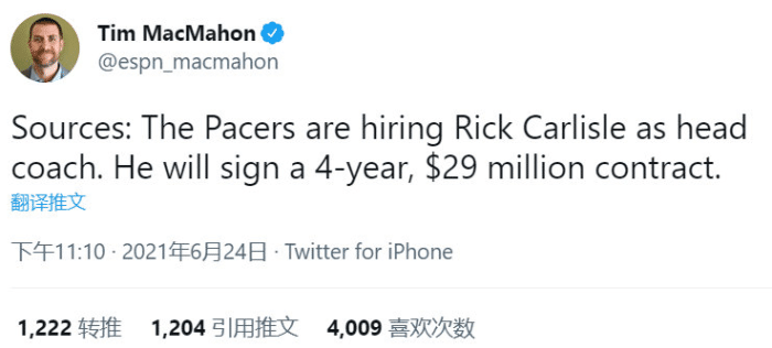 来源:JRS直播网06-25 15:31JRS直播网讯北京时间6月24日,来自名记蒂姆·麦克马洪的报道,步行者将聘请前独行侠主帅卡莱尔,担任球队新的主教练。双方将签订一份为期4年,总价2900万美元的合同。卡莱尔曾在2003年到2007年执教步行者,并一度率队打出61胜21负的骄人战绩。此番再续前缘,步行者显然希望卡莱尔率队迎来突破!