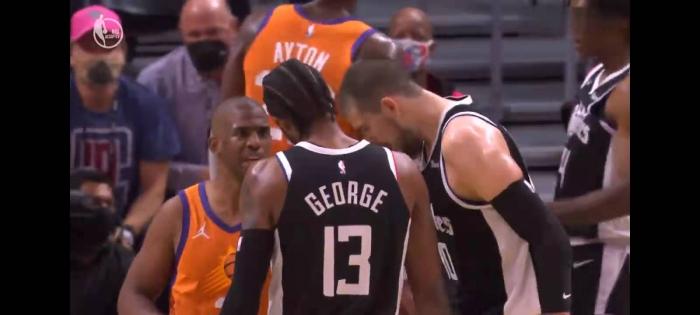 布克为何会大笑呢?其实从慢镜头上我们不难找到答案,原来在布克下场后,老大哥保罗挺身而出为了布克和快船队的核心乔治进行了一番理论,看到老大哥如此暖心的举动以及保罗这种淡定的人还会出现如此激动的情况,场上的一幕也让布克露出了笑容。