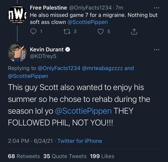 一球迷留言:皮蓬因为偏头痛缺席了系列赛第七场,软蛋小丑;杜兰特回复道:斯科特这家伙也想享受他的休赛季,所以他选择了在赛季中养伤康复;哈哈哈,斯科特-皮蓬,他们都跟随菲尔-杰克逊,而不是你!