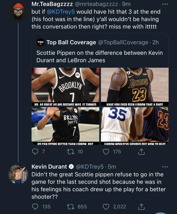 美媒晒出皮蓬质疑杜兰特的言论,球迷评论道:如果杜兰特最后时刻没有踩线而是投进三分,也就没有这样的讨论了;杜兰特用大号回复球迷:伟大的斯科蒂-皮蓬在最后一秒投篮时拒绝参上场,难道不是因为他觉得他的教练为更好的射手制定了战术?