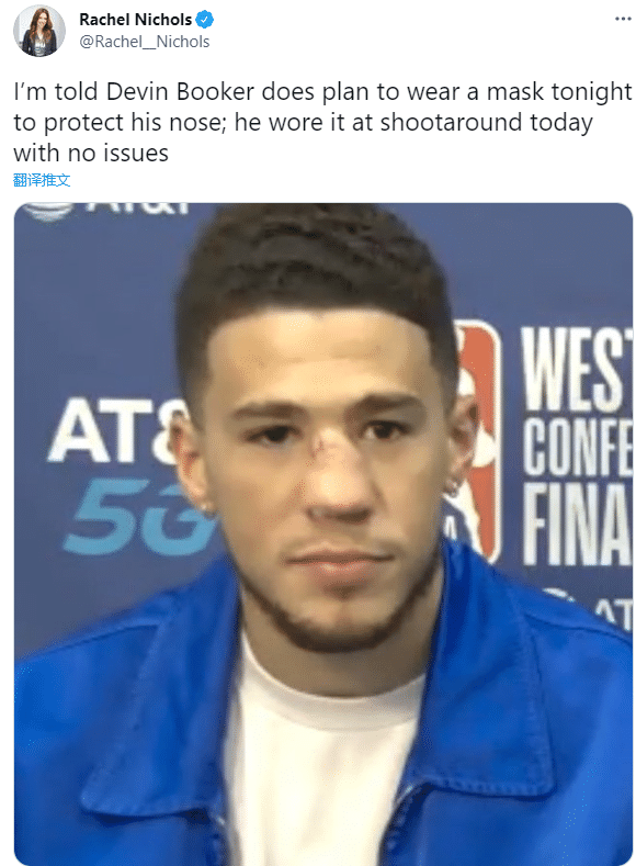 汉密尔顿透露之后,名记Rachel Nichols报道,布克将会佩戴面具登场从而来保护他的鼻子,赛前投篮训练时,布克戴着面具,没有感到任何不适。