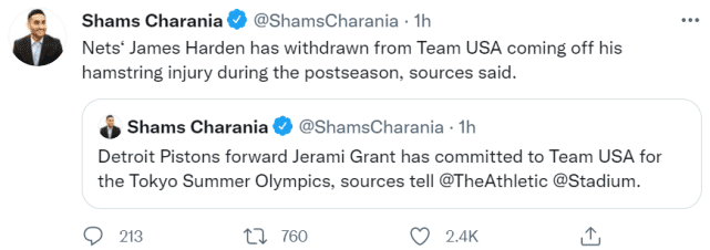 格林和杜兰特一起参加过2016年的奥运会,这也是自从杜兰特加盟篮网后,两人再次成为队友。乐福也曾在2012年的奥运会上拿过金牌。杜兰特、格林和乐福是名单上仅有的3位打过奥运会的球员。