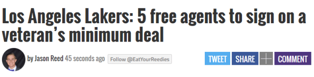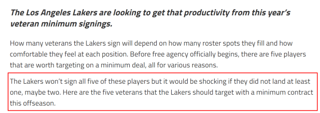 来源:JRS直播网06-24 14:58JRS直播网讯 季后赛首轮出局,湖人势必需要补强阵容。不过,受限于薪金空间,老将底薪合同将是佩林卡在休赛期的主要签约模式。北京时间6月24日,洛城媒体Lakeshowlife列出了五大底薪签约的目标,并指出湖人不会签下所有这五位球员,但如果他们没有至少签下其中一两位,那将是令人惊讶的。