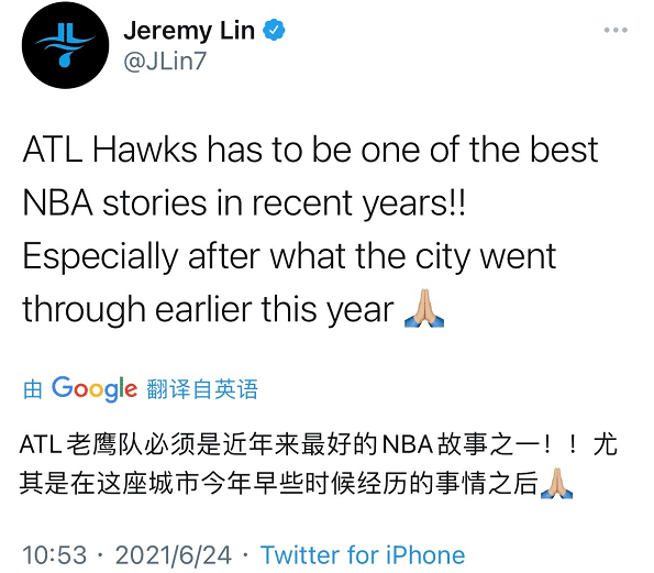 这场比赛结束之后,林书豪点评老东家,称:“亚特兰大老鹰队一定是近年来NBA最棒的球队之一!!特别是在今年早些时候经历了一些事之后”