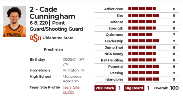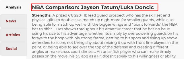 知名选秀网站NBADRAFT给坎宁安打出来的能力总分是100分,其中,体型、领导力、潜力、传球、无形资产这5项为9分最高分。此前,他的模板曾经是格兰特-希尔,但现在坎宁安的最新模板变成了塔图姆和东契奇。以两位天才新星为模板,也足见外界对坎宁安的期待有多高。