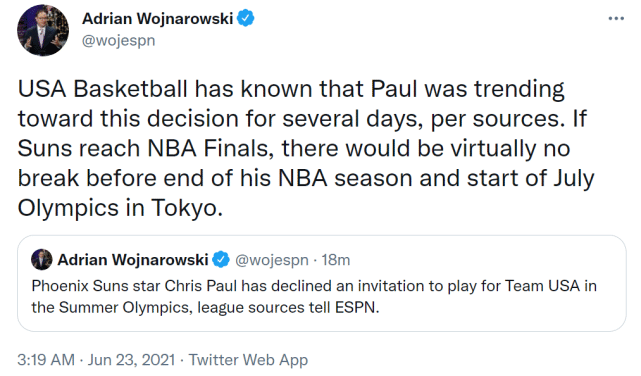 来源:JRS直播网06-23 10:49JRS直播网讯 北京时间6月23日,据名记沃纳罗斯基报道,太阳球星克里斯-保罗已经拒绝了美国男篮的邀请,将不会参加今年夏天的东京奥运会。如果太阳打进总决赛,保罗的体能会受到严峻的考验,因为NBA赛季结束和奥运会开始之间没有休整的时间。