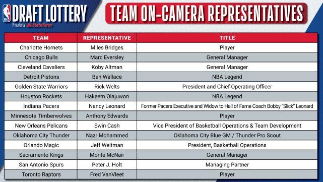 来源:JRS直播网06-22 11:32JRS直播网讯 北京时间6月22日,NBA官方公布了14支NBA球队的乐透抽签代表名单,而明天,NBA将进行乐透抽签仪式。具体的代表名单如下——