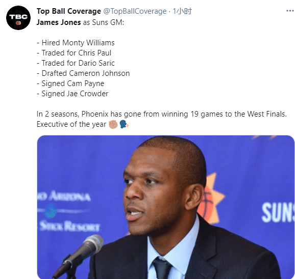 詹姆斯-琼斯成为太阳总经理期间,他聘用了蒙蒂-威廉姆斯,通过交易引援保罗、萨里斯,签下佩恩和克劳德,以及选中卡梅隆-约翰逊;在琼斯的一系列操作下,太阳今年不仅终结10年无缘季后赛的尴尬纪录,而且季后赛先后淘汰湖人和掘金,杀进了西部决赛。