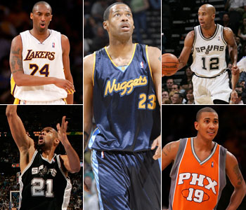 蒂姆-邓肯(马刺)、布鲁斯-鲍文(马刺)、马库斯-坎比(掘金)、科比-布莱恩特(湖人)、拉加-贝尔(太阳)